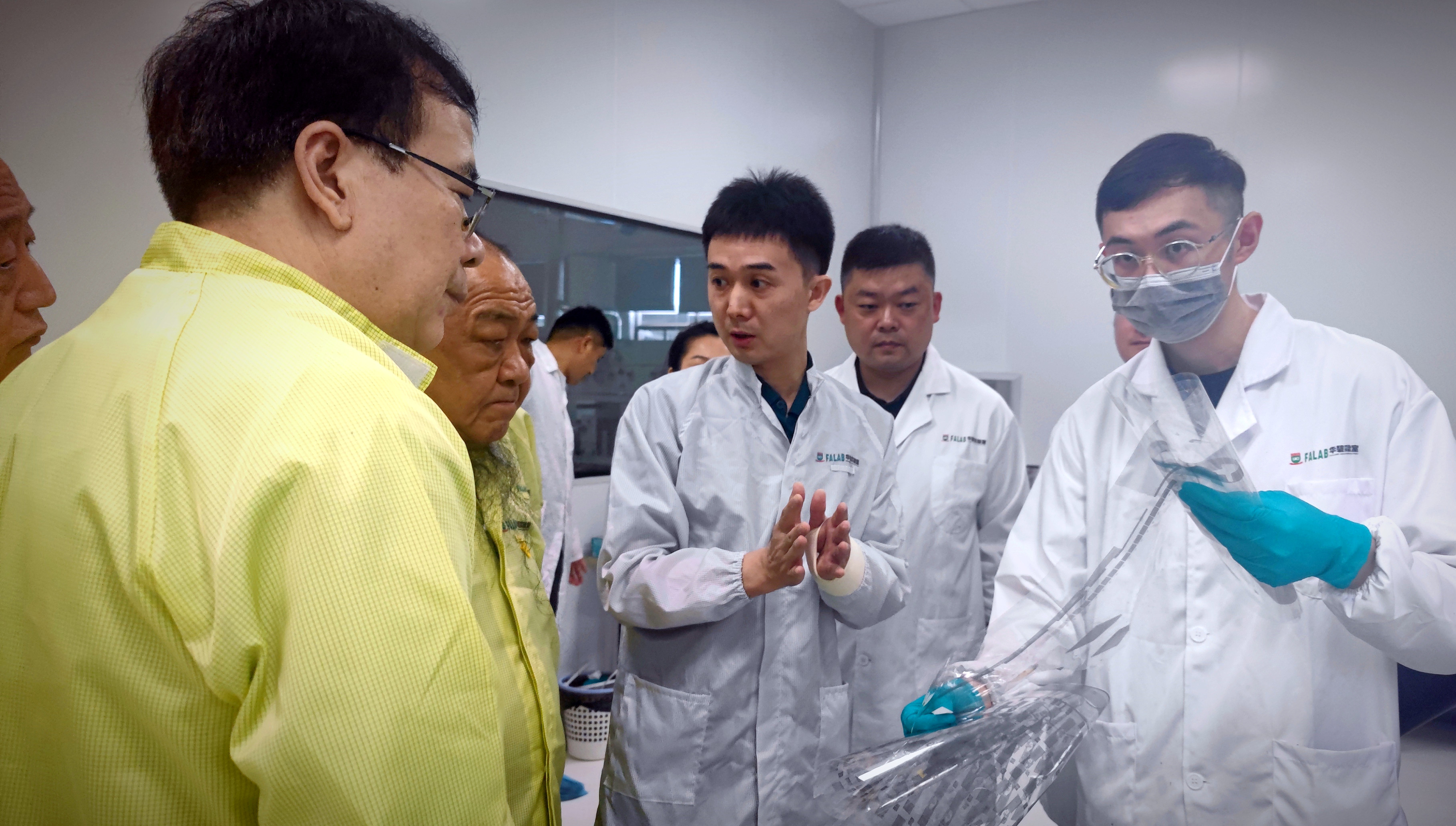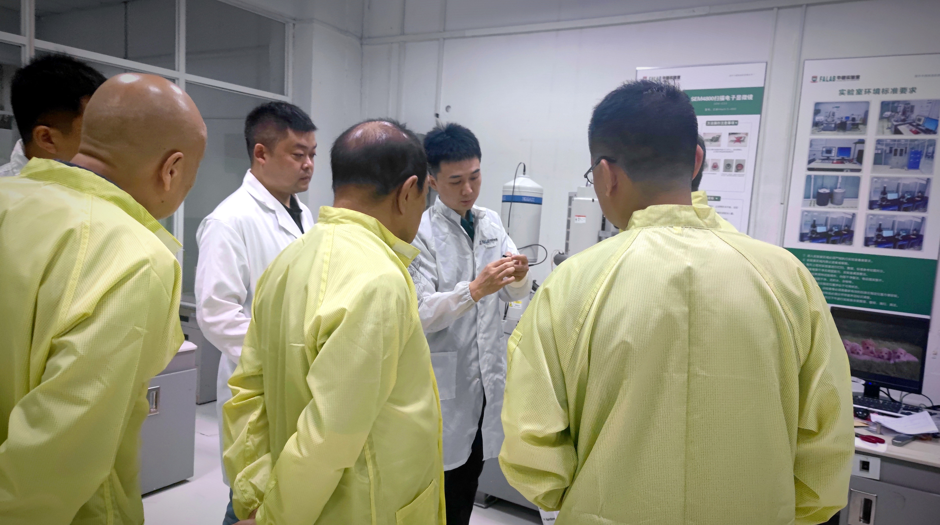 陳涵霖一行實地參觀了華碧新能源柔性鈣鈦礦太陽能實驗室、鈣鈦礦材料實驗室、組件技術實驗室、分析檢測中心等實驗室平臺,考察了華碧新能源的科研進展和儀器設備配置情況,并就柔性鈣鈦礦領域高新技術的研發和應用等問題向有關專業負責人詢問和交流。