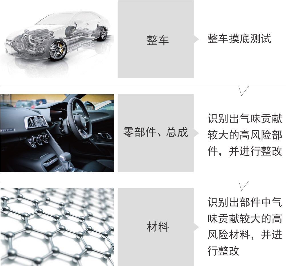 通過整車特定部位小范圍加熱測試其揮發(fā)物,確定重點總成;重點總成與重點材料均經(jīng)過常溫、高溫測試。