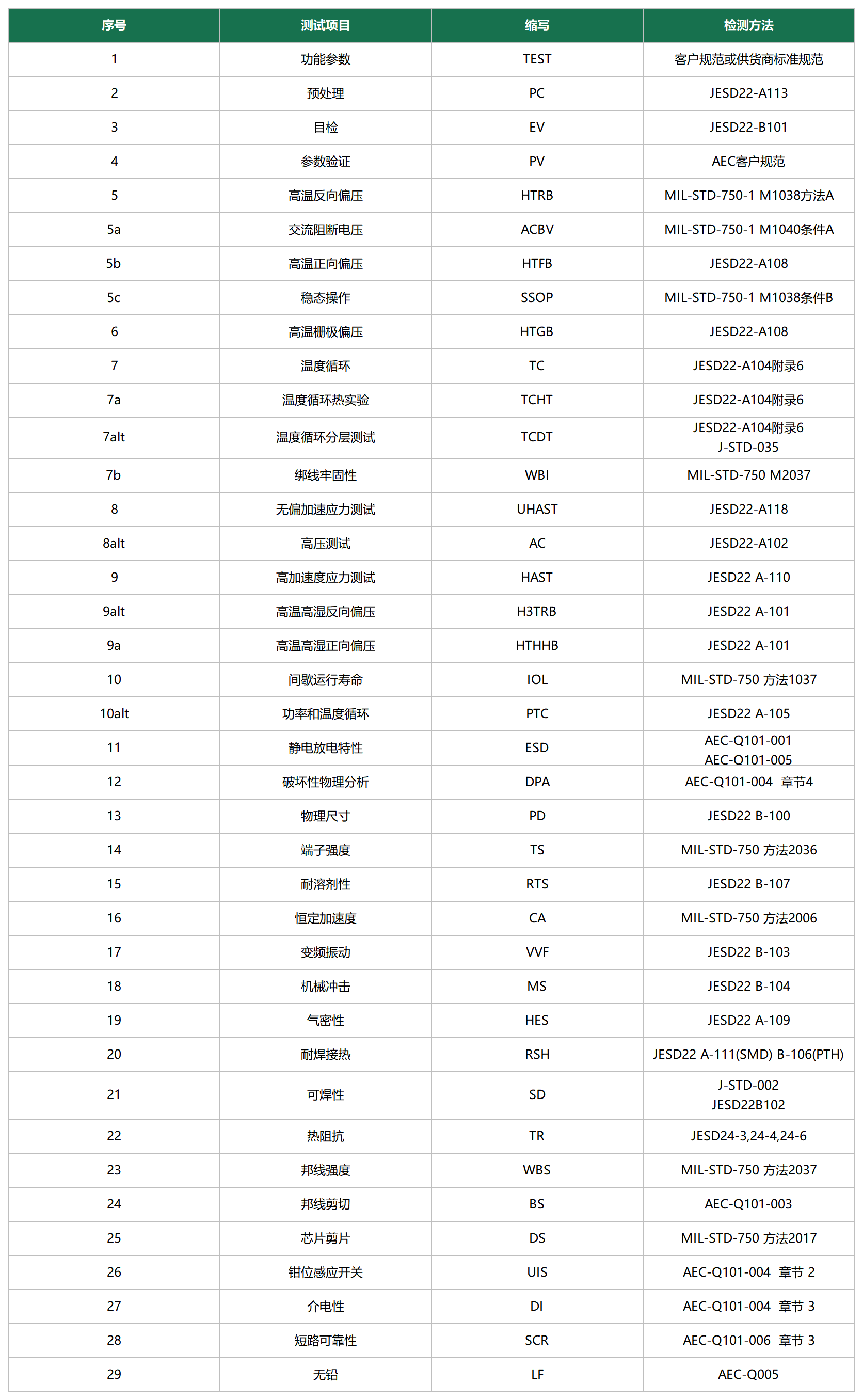AEC Q101是基于失效機理的離散半導體元件應力測試鑒定,由AEC委員會制定,適用于車用離散半導體元件的綜合可靠性測試認證標準,是離散半導體元件應用于汽車領域的基本門檻。首版于1996年發行,并持續更新到2021年的E版本,也是目前沿用的* 新標準。AEC Q101標準是離散半導體元件(依產品類型、封裝形貌及取樣數量的要求)執行并通過的必要測試項目。